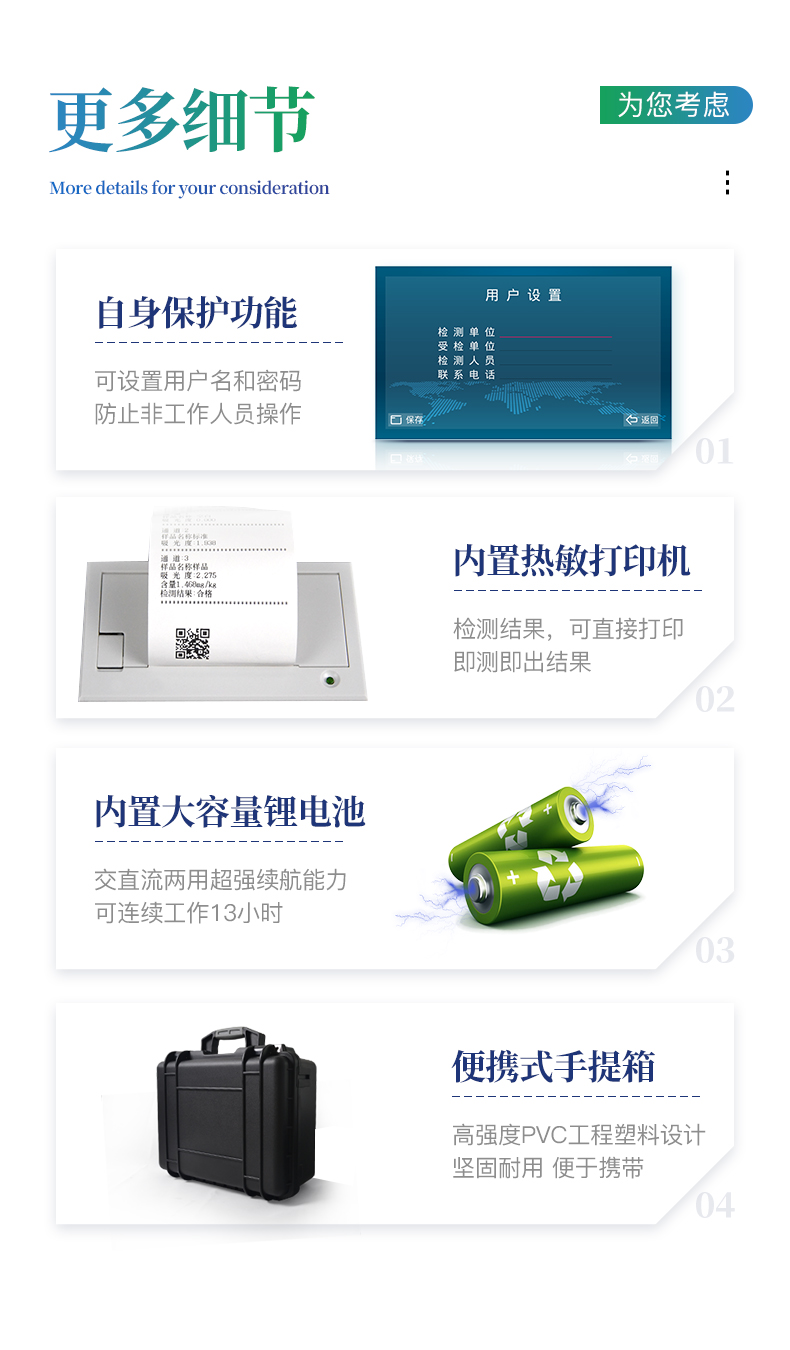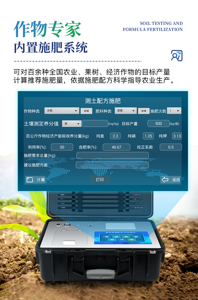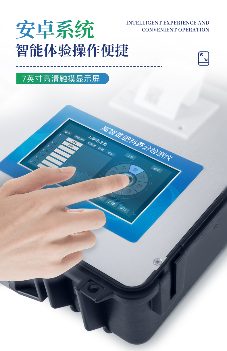 | 可檢測化肥、有機肥(含葉面肥、水溶肥、噴施肥等)、植株中的速效氮、速效磷、有效鉀、全氮、全磷、全鉀、有機質、酸堿度,鈣、鎂、硫、鐵、錳、硼、鋅、銅、氯、硅、鉬等各種中微量元素以及鉛、鉻、鎘、汞、砷、鎳、鋁、氟、鈦、硒等各種重金屬含量。 | 安卓智能操作系統,采用更加**和人性化操作,儀器標配wifi聯網上傳、4G聯網傳輸、GPRS無線遠傳,快速上傳數據。 | 內置作物專家施肥系統,可對百余種全國農業、果樹、經濟作物的目標產量計算推薦施肥量,依據施肥配方科學指導農業生產。 | 采用精密旋轉比色池設計,光源一致性更加**保證檢測精度。一次性可快速檢測12個樣品,極大提升檢測效率,降低檢測成本。 | 內置植物營養診斷標準圖譜,根據各農作物營養缺失的圖片,進行葉面對比,診斷豐缺。 | 采用高精度濾光片技術自主**分析方法(**號:ZL 2018 2 1777724.7),比色槽部分采用標準1cm比色皿,無機械位移及磨損,光路測試定位**,保證檢測結果優于國標要求。 | 儀器配有數據接收平臺,無需數據線,數據可直接局域網和互聯網無線上傳,方便進行數據管理和數據長期分析。 | 儀器內置新一代高速熱敏打印機,檢測完成可自動打印檢測報告和二維碼。 | 高靈敏7寸電容觸摸屏,高清晰高交互顯示,大程度降低傳統儀器的繁瑣操作和失誤。 | 每個通道均配置四波長冷光源,所有光源實現恒流穩壓,保證波長穩定。 硅半導體作為信號接收系統,壽命長達10萬小時級別。重現性好,準確度高。 | 高強度PVC工程塑料手提箱設計,堅固耐用,便于攜帶,供電方式為交直流兩用,可野外流動測試配套成品藥劑。 |