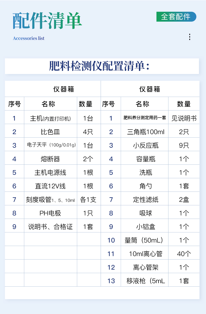 | 名稱 | 肥料養分測定用藥一套 | 三角瓶100ml | 小反應瓶 | 容量瓶 | 洗瓶 | 角勺 | 定性濾紙 | 吸球 | 小鋁盒 | 量筒(50mL) | 10ml離心管 | 離心管架 | 移液槍(5mL) |