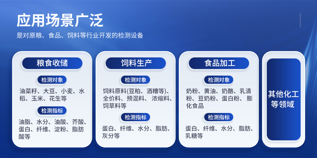 檢測對象:飼料原料(豆粕、酒糟等)、全價(jià)料、預(yù)混料、濃縮料、飼草料等 檢測指標(biāo):蛋白、纖維、水分、脂肪、灰分等; | ◆ 食品加工: