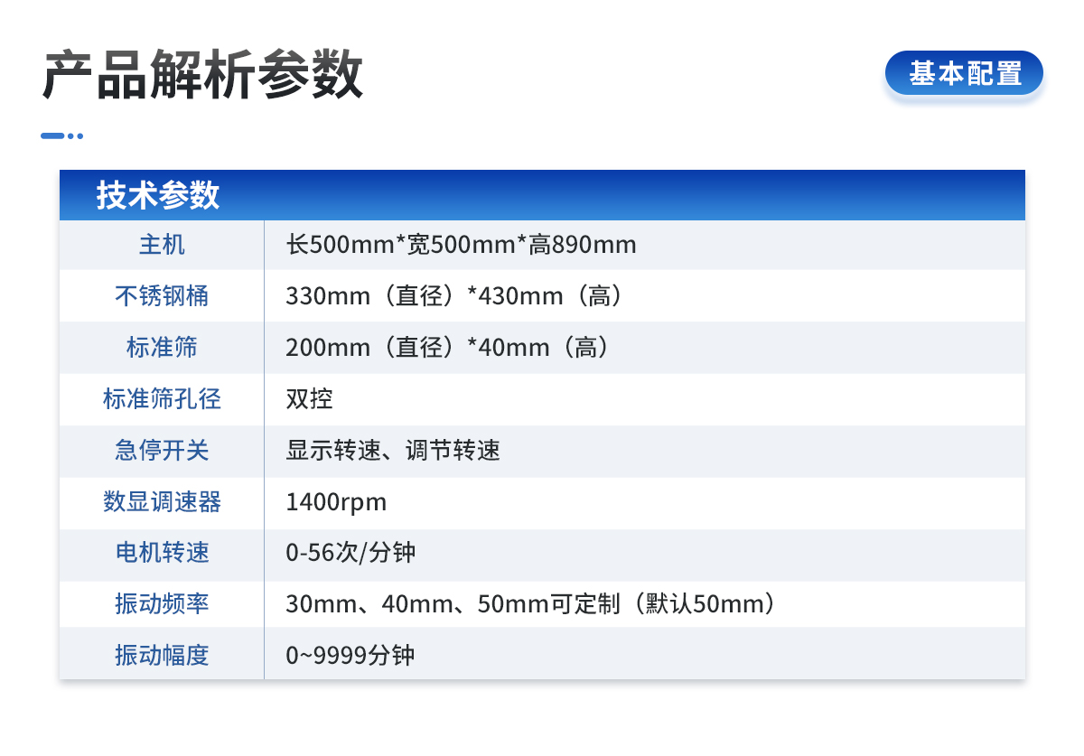 | 1、主機:長500mm*寬500mm*高890mm | 2、水桶:200mm(直徑)*400mm(高) | 3、標準篩:100mm(直徑)*40mm(高) | 4、標準篩孔徑:5mm,3mm,2mm,1mm,0.5mm,0.25mm。(可選配其他規格孔徑) | 5、急停開關:雙控 | 6、數顯調速器:顯示轉速、調節轉速 | 7、電機轉速:1400 rpm | 8、振動頻率:0-56次/分鐘 | 9、振動幅度:30mm、40mm、50mm可定制(默認50mm) | 10、計時:數顯計時器 | 11、定時范圍:0~9999分鐘 | 12、電源:220V 50Hz 120W | 13、漏電保護器:10A |
