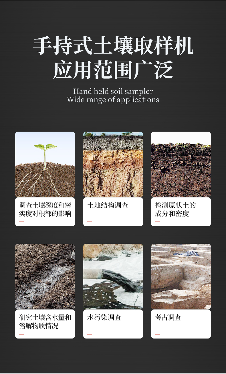 | 旋轉(zhuǎn)式,上下沒(méi)有擾動(dòng),不會(huì)破壞土壤剖面結(jié)構(gòu) | 采樣量大,插銷連接,易于拆卸。 | 鉆頭帶有鋸齒,通過(guò)沖擊錘鉆入土壤,入土容易。 | 筒型鉆頭獨(dú)特可拆卸裁口設(shè)計(jì),取樣容易。 | 樣品處于比較寬松的柱狀圓筒中,取出十分容易 | 狀土壤很難被壓縮(保持原狀) | 采集一個(gè)樣本就可以研究整個(gè)土壤剖面情況 | 比開挖一個(gè)采樣坑要節(jié)約時(shí)間和減少樣本破壞 | 可有效地用于所有類型的土壤 |