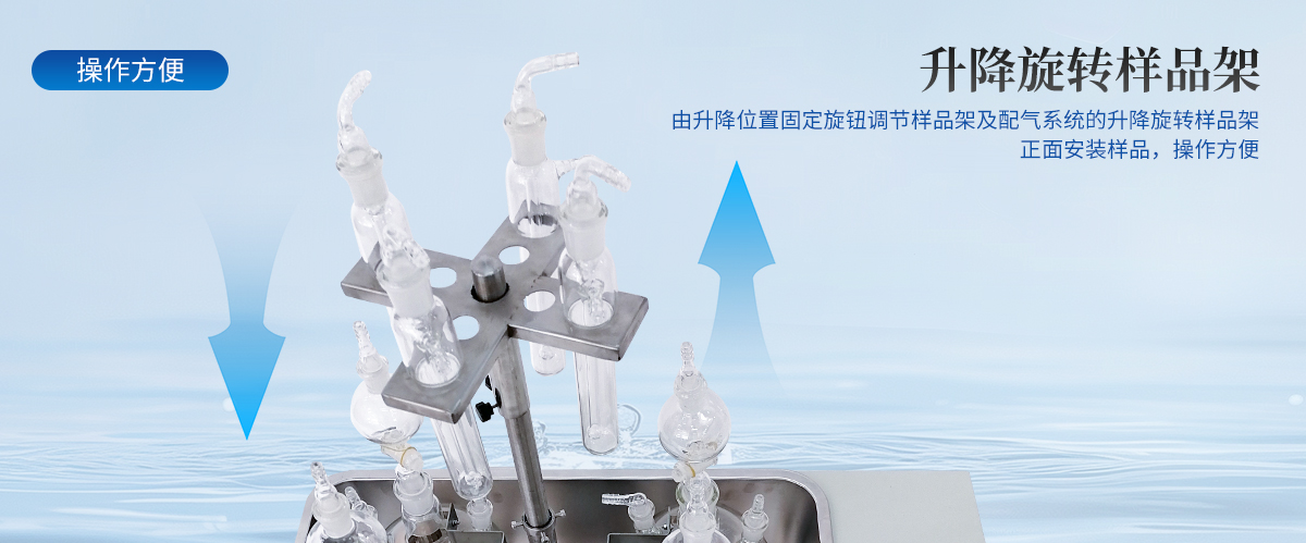 | 1.大容量反應瓶,可同時處理多個樣品。 | 2.鹽酸口、氣體進口、出口三口一體且相互獨立,操作會不干擾。 | 3.恒溫水浴加熱,具有快速自動恒溫控制系統,加熱溫度可以手動設定。 | 4.由升降位置固定旋鈕調節樣品架及配氣系統的升降旋轉樣品架,正面安裝樣品,操作方便。 | 5.每個樣品的氮氣流量獨立控制調節或關閉,針閥氣體流量計準確控制和顯示氣體總消耗量。 |