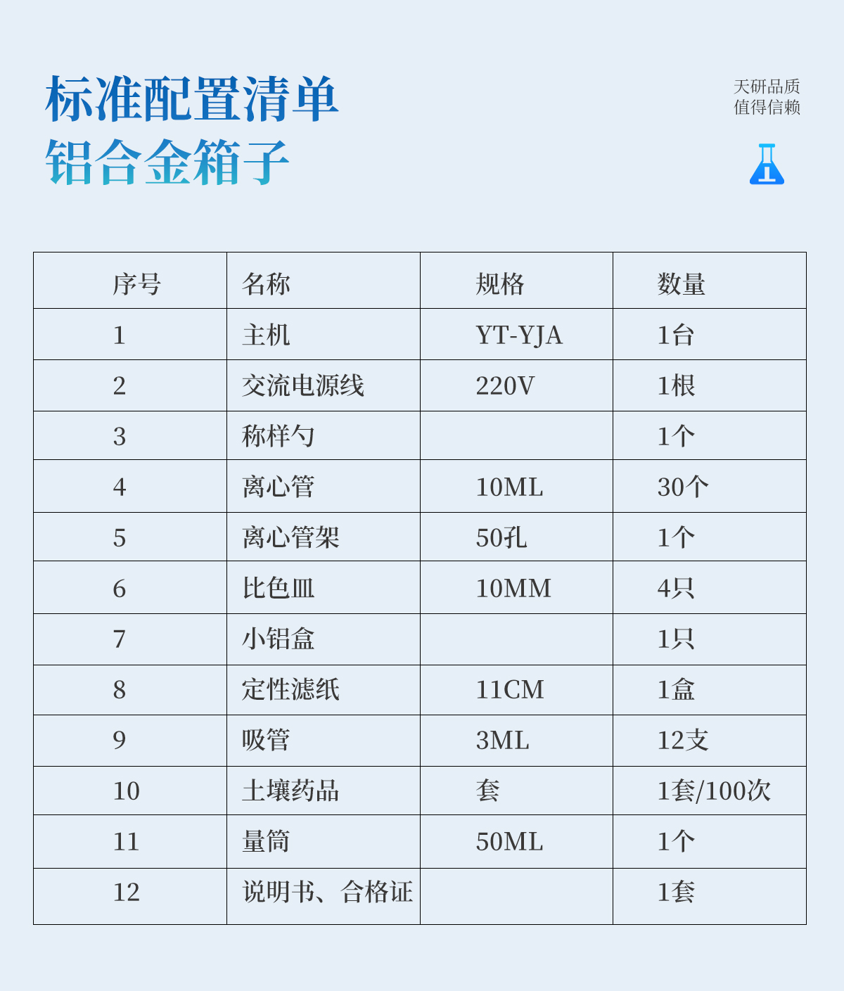| 名稱 | 主機 | 交流電源線 | 稱樣勺 | 離心管 | 離心管架 | 比色皿 | 小鋁盒 | 定性濾紙 | 吸管 | 土壤藥品 | 量筒 | 說明書、合格證 |