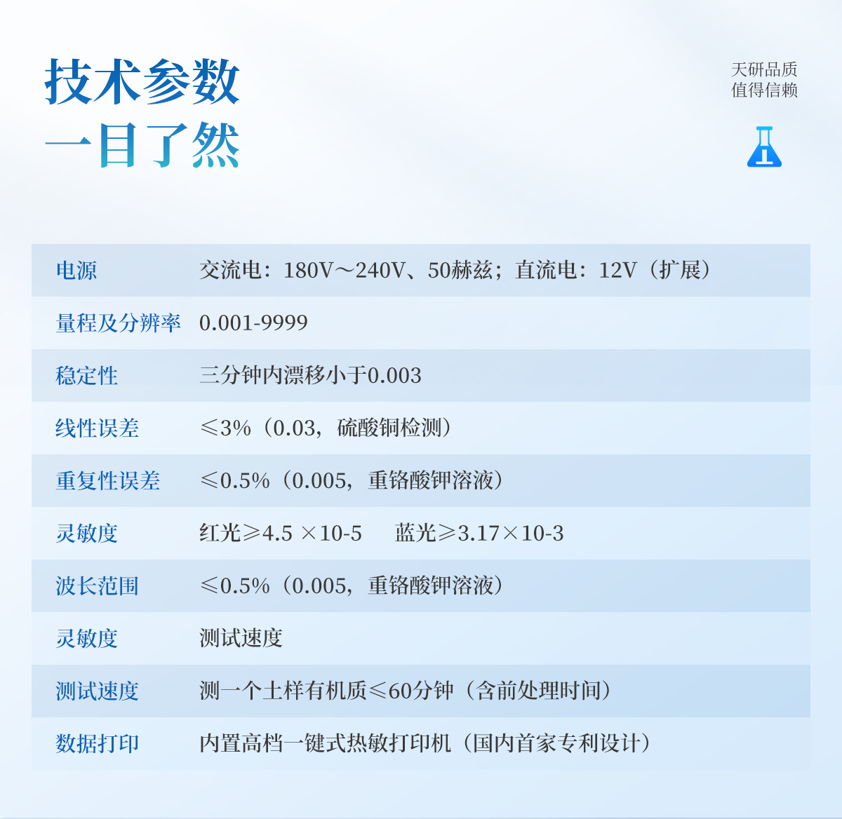 | 電源:交流電:180V~240V、50赫茲;直流電:12V(擴展) | 量程及分辨率:0.001-9999 | 穩定性:三分鐘內漂移小于0.003 | 線性誤差:≤3%(0.03,硫酸銅檢測) | 重復性誤差:≤0.5%(0.005,重鉻酸鉀溶液) | 靈敏度:紅光≥4.5 ×10-5 藍光≥3.17×10-3 | 波長范圍:紅光620±8nm 藍光440±8nm | 測試速度:測一個土樣有機質≤60分鐘(含前處理時間) | 可同時檢測8個土樣≤個小時(含前處理時間) | 數據打印:內置高檔一鍵式熱敏打印機(國內首家**設計) |