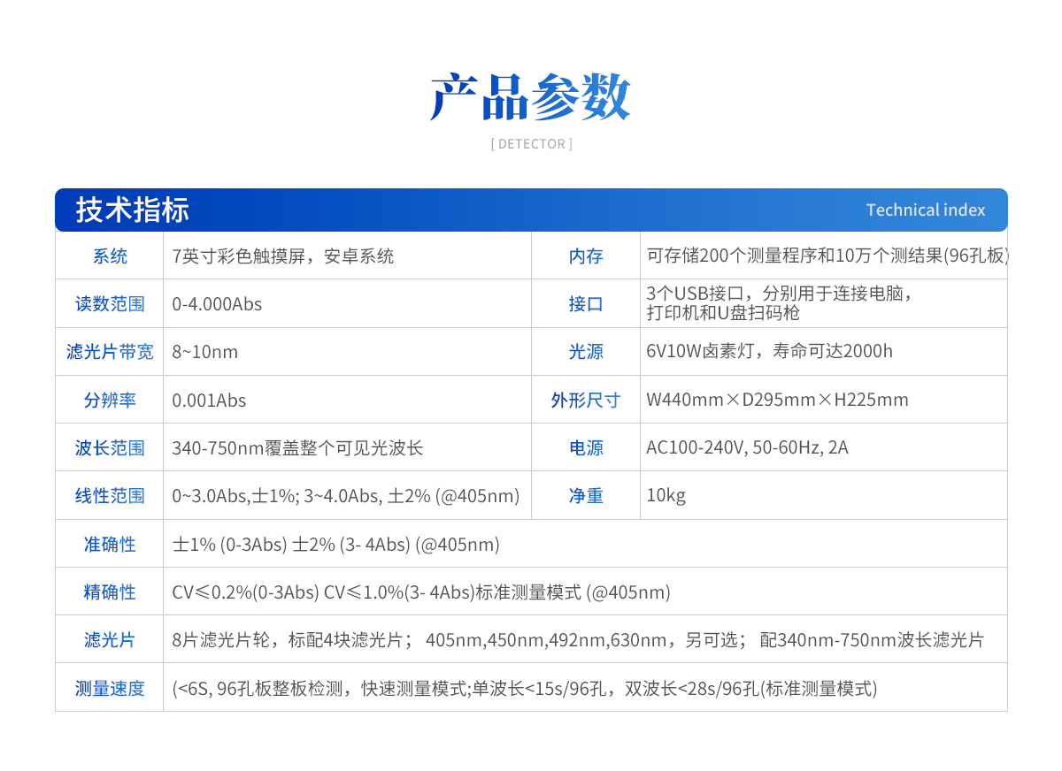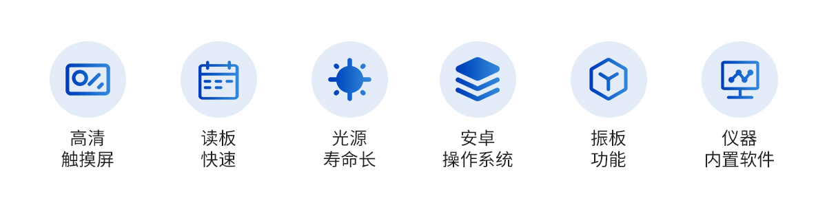 | 1. 高清觸摸屏: 顯示使用7英寸彩色觸摸屏,分辨率為1280*800像素。 | 2.內置軟件: 內置軟件可提供儀器的控制和數據分析,可直接外接U盤。 | 3. 光源壽命長: 光源采用6V10W鹵素燈,壽命可達2000h。 | 4. 讀板快速: 采用單波長,雙波長檢測讀板快速。 | 5. 振板功能: 根據使用配置了振板功能,可根據使用設置振板時間和速度。 | 6. 操作系統: 配備自主研發的安卓操作系統可單機獨立使用,同時配置多種數據 輸出接口,方便不同的數 據傳輸和處理。 | 7. 可視化布板: 并采用可視化布板方式輸出測試結果。 | 8. 設置吸光度范圍:0~4.000Abs,滿足不同測量要求,并配備了8組濾光片輪,標配4組濾光片,根據使用 可選配340 nm~750nm波長的濾光片組合使用。設計合理無需打 開機蓋就可更換光源和濾光片。 | 9.檢測數據:使用自動校準、定位系統算法使檢測數據更精準、可靠。 | 10. 配置對光路: 配置對光路,機械運動等進行自檢和診斷校對功能。 |