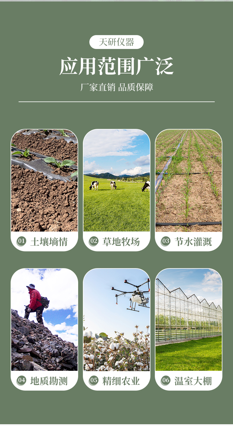土壤水分溫度鹽分PH測定儀采用一體化結構設計,可快速準確測量土壤中含水量、溫度、電導率(鹽分)、酸堿度,可對多處樣地、不同土壤深度的水分含量溫度鹽分和PH進行快速檢測和長期連續監測。廣泛應用于土壤墑情檢測、旱作節水灌溉、精細農業、林業、地質勘探、植物培育、水利、環保等領域。