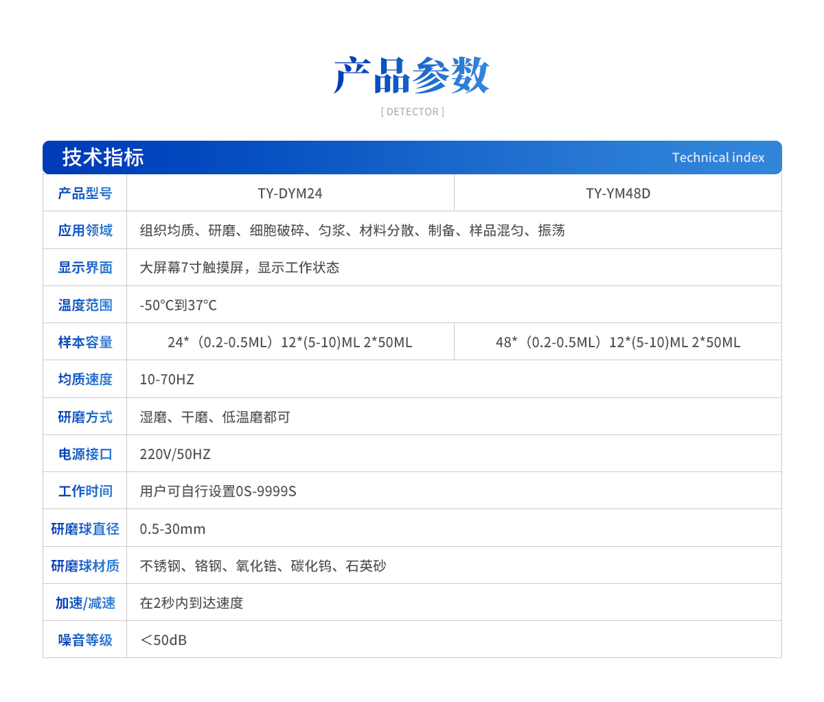 | 1、操作數量多: **快速的工作可以在1分鐘內完成2×24、2×48、4×25個樣品的研磨。省時省力,批間,批內差異小。抽提的蛋白比活更高,核酸片斷更長。 | 2、無交叉污染: 樣品管在破碎過程中處于全封閉狀態,可采用一次性離心管和珠子。樣品完整保留在管內,避免樣品間的交叉污染以及外界污染。 | 3、操作簡便:內置程序控制器,可對研磨時間、轉子的振動頻率等參數進行設置。 | 4、穩定性好:采用垂直振蕩方式,研磨更充分,穩定性更好;儀器運行過程中,噪音小于70dB,不會對其它實驗或儀器產生干擾。 | 5、方便低溫操作:當需要低溫研磨環境,可將放有樣本的適配器浸入液氮中冷卻1-2分鐘,取出后移至主機快速固定即可開始研磨,不需要進行再次冷凍處理,節省液氮。 | 6、重復性好:同一組織樣本設定相同程序,獲得相同的研磨效果。工作時間短,樣本溫度不會上升。 | 7、順流高通量組織研磨機適用于各種植物組織包括根莖、葉花果、種子等樣品的研磨破碎。 | 8、其適用于各種動物組織包括大腦心臟、肺胃、肝臟、胸腺、腎臟、腸、淋巴結、肌肉、骨骼等樣品的研磨破碎。 | 9、高通量組織研磨機適用于真菌、細菌等樣品的研磨破碎。 | 10、順流高通量組織研磨機適用于食品、藥品成分分析檢測的研磨破碎。 | 11、適用于易揮發樣品包括煤炭、油頁巖、蠟制品等樣品的研磨破碎。 | 12、該高通量組織研磨機還適用于塑料、聚合物包括 PE、PS、紡織品(毛線)、樹脂等樣品的研磨破碎。 |