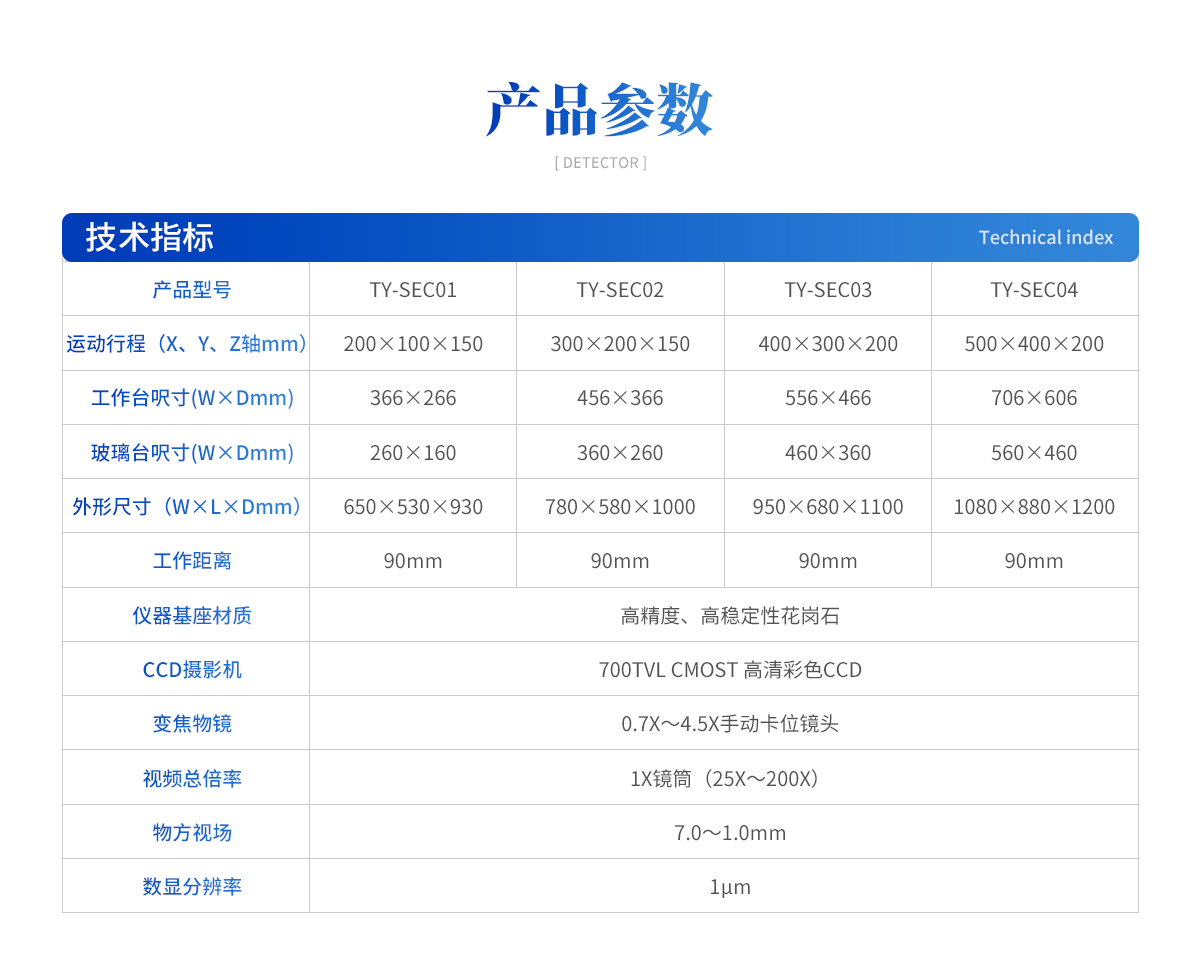 | 1、 運動行程(X、Y、Z軸mm):500×400×200 2、 工作臺呎寸(W×Dmm): 706×606 3、 玻璃臺呎寸(W×Dmm): 560×460 4、 外形尺寸(W×L×Dmm): 1080×880×1200 5、 工作距離:90mm 6、 儀器基座材質:高精度、高穩定性花崗石 7、 CCD攝影機:700TVL COMST模擬信號相機 8、 變焦物鏡: 0、7X~4、5X手動卡位鏡頭 9、 視頻總倍率:1X鏡筒(25X~200X) 10、 物方視場: 7、0~1、0mm 11、 數顯分辨率:1μm 12、 X、Y坐標測量示值誤差≤(3+L/200)μm , L為被測長度(單位:mm) |