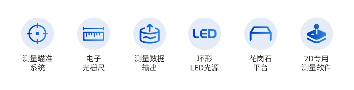 | 儀器基座 | CCD | 鏡頭 | 光柵尺 | 導軌 | 傳動 | 表面光源 | 底光源 | 數據采集卡 | 影像測量軟件 | 光學校正片 | 電纜 |