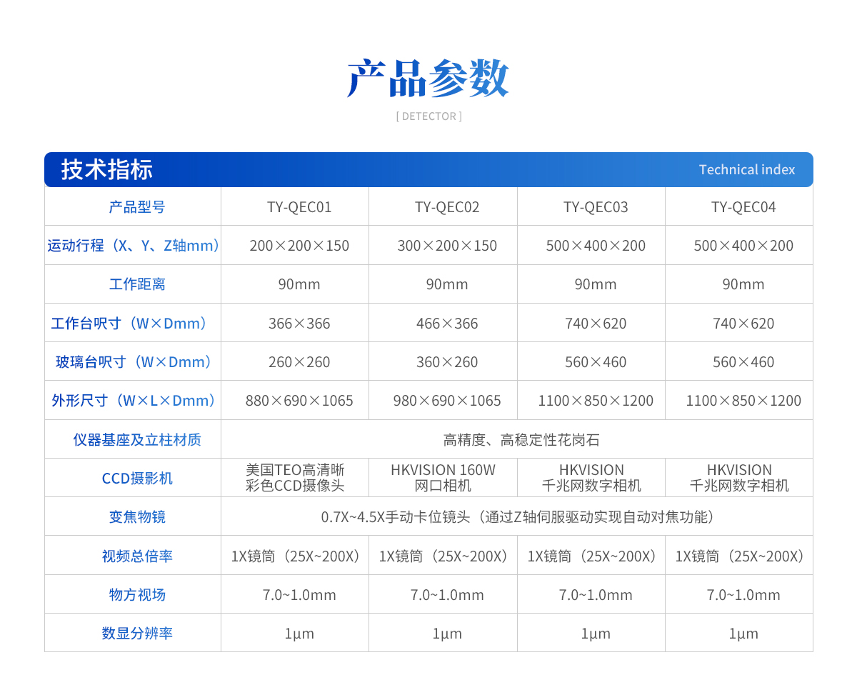 | 高穩定性高精度花崗石材質 | HIKVISION 160W千兆網數字相機 (海康HIKVISION) | 0、7~4、5 X手動卡位鏡頭(萊斯) | 高精度位移傳感電子尺,分辨率:1μm (精微) | 咸陽藍博P級精密V型導軌(LB) | XYZ軸TBI精密滾珠絲桿(200mm) | 4000P伺服電機(UWC) | 多功能一體化集成運動控制盒(UWC) | 四環八分區表面光源、單顆綠色LED底光源 | DT-3 | INS 全自動影像測量軟件 (INS) | INS-C | DTW定制/td> | AC :110/220V | 自動影像儀器專用電腦+19、5”顯示器 |