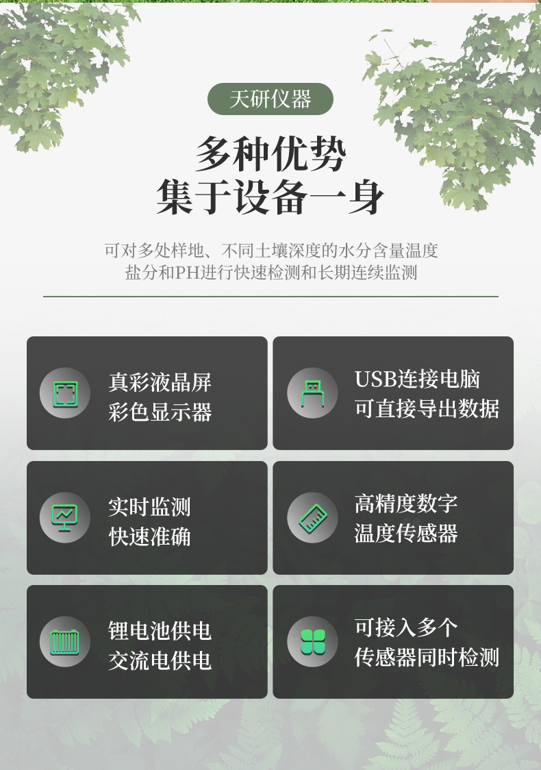土壤水分溫度鹽分測定儀傳感器采用一體化結構設計,可快速準確測量土壤中含水量、溫度和電導率(鹽分),可對多處樣地、不同土壤深度的水分含量溫度和鹽分進行快速檢測和長期連續監測。廣泛應用于土壤墑情檢測、旱作節水灌溉、精細農業、林業、地質勘探、植物培育、水利、環保等領域。